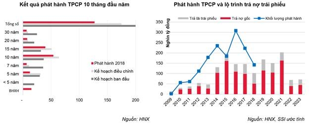 Ngoài lý do giải ngân đầu tư công chậm, một lý do khác khiến phát hành thấp là lượng đáo hạn trong 10 tháng năm 2018 chỉ là 27 nghìn tỷ đồng so với 85 nghìn tỷ đồng của cùng kỳ 2017. Tổng khối lượng phát hành ròng trong 10 tháng giảm khoảng 10 nghìn tỷ đồng so với cùng kỳ, cho thấy việc phát hành trái phiếu Chính phủ trong năm nay không ảnh hưởng đến thanh khoản của hệ thống ngân hàng.