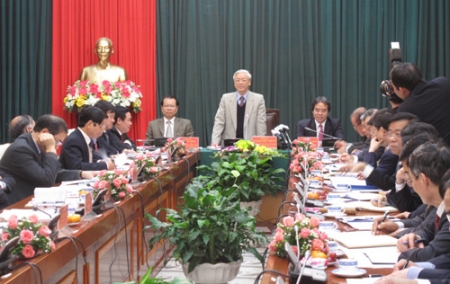 Tổng Bí thư đề nghị Ngân hàng Nhà nước thời gian tới cần bám sát tư tưởng chỉ đạo của Đảng, Quốc hội, Chính phủ, tổng kết thực tiễn rút kinh nghiệm, bài học trong xử lý các tình huống để làm tốt nhiệm vụ trong năm 2013 - năm bản lề của nhiệm kỳ Đại hội lần thứ XI. Tổng Bí thư Nguyễn Phú Trọng yêu cầu phải tháo gỡ khó khăn cho các doanh nghiệp tiếp cận được nguồn vốn, phải điều hành lãi suất phù hợp, bảo đảm thanh khoản vững vàng hơn, dài hạn hơn và tiếp tục tái cơ cấu hệ thống ngân hàng thật vững chắc.