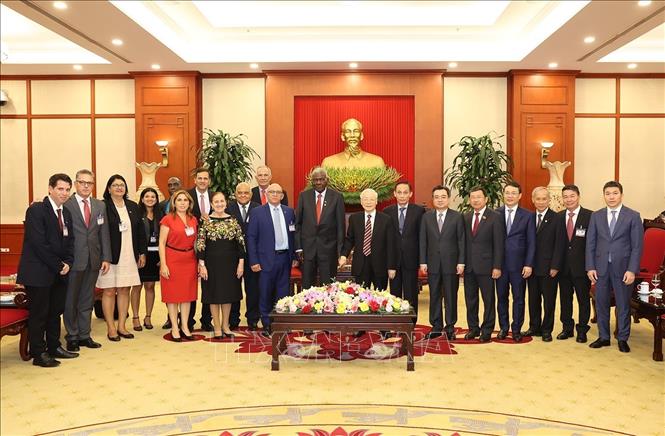 | Tổng Bí thư Nguyễn Phú Trọng và Chủ tịch Quốc hội Cuba Esteban Lazo Hernandez cùng các đại biểu |