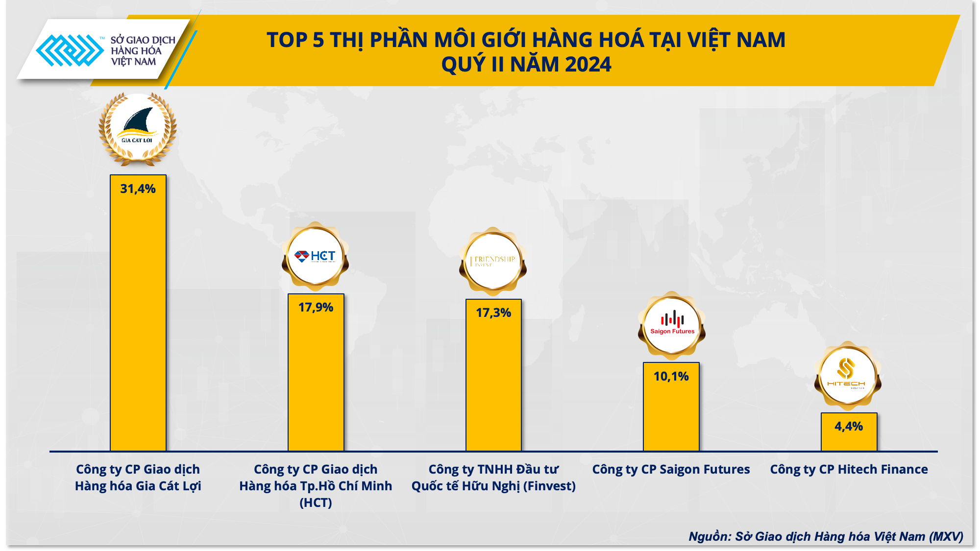 Theo đó, CTCP Giao dịch Hàng hóa Gia Cát Lợi mở rộng thị phần từ 25,8% lên 31,4%, tiếp tục duy trì vị trí số 1 về thị phần môi giới giao dịch hàng hóa tại Việt Nam. Là một trong những Thành viên đầu tiên và có quy mô văn phòng, chi nhánh lớn nhất cả nước, Gia Cát Lợi hiện có số lượng tài khoản giao dịch lớn nhất, chiếm hơn 40% tổng số lượng tài khoản toàn thị trường.