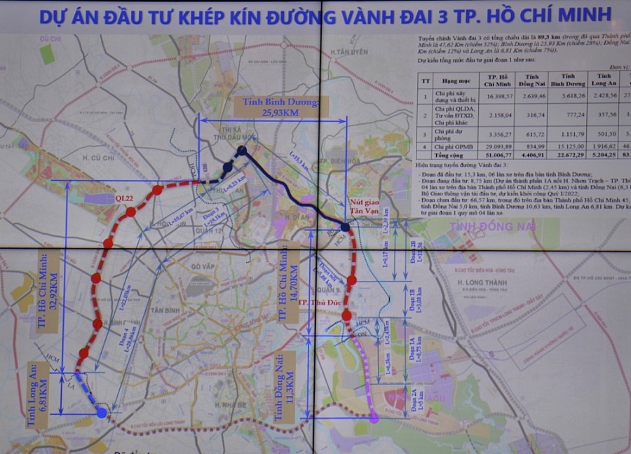Dự án Vành đai 3 TP.HCM chuẩn bị được chính thức khởi công ngày 18/6 với chiều dài hơn 76 km, chạy qua địa phận TP.HCM và các tỉnh Bình Dương, Đồng Nai, Long An. Trong giai đoạn 1, dự án làm 4 làn xe cao tốc và đường song hành hai bên (bố trí không liên tục), quy mô mỗi bên từ 2-3 làn xe. Dự án giải phóng mặt bằng trên 640 ha đất, gần 3.900 hộ dân bị ảnh hưởng. Tổng kinh phí đền bù, giải phóng mặt bằng cho dự án khoảng 41.600 tỷ đồng, trong đó TP.HCM có kinh phí lớn nhất với hơn 25.600 tỷ đồng.