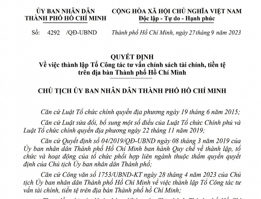 | UBND TP.HCM quyết định thành lập Tổ công tác tư vấn chính sách tài chính, tiền tệ |