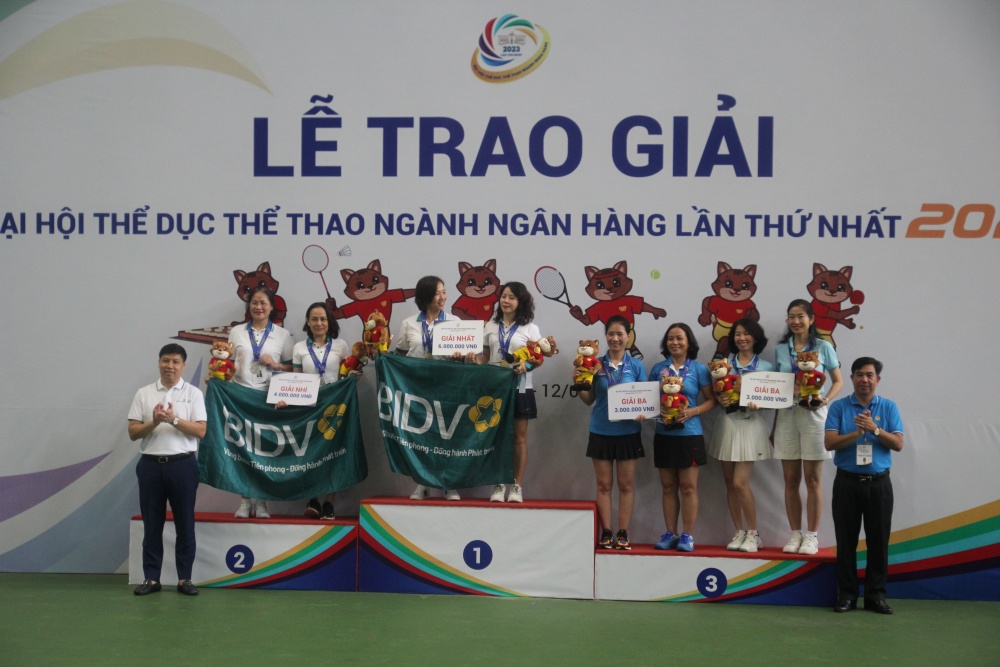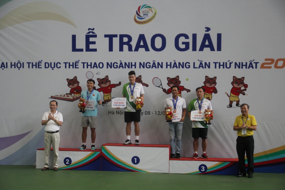 Đồng chí Đào Minh Tú, Phó Thống đốc Thường trực NHNN, Chủ tịch Công đoàn Ngân hàng Việt Nam cùng các thành viên Ban tổ chức trao giải cho các vận động viên môn tennis