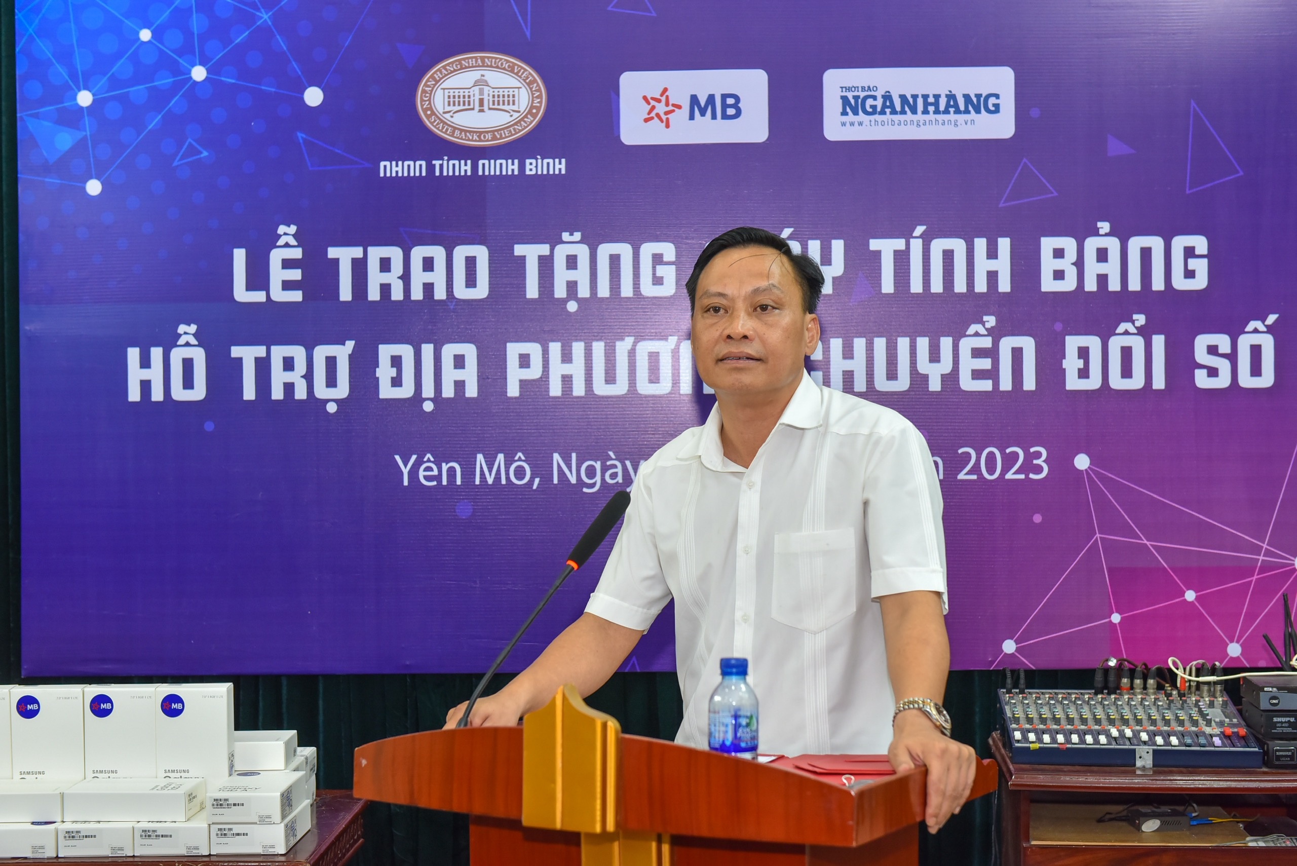 Được biết, huyện Yên Mô là một địa phương có nhiều tiềm năng về mọi mặt kinh tế - xã hội và đi đầu trong công tác chuyển đổi số của tỉnh Ninh Bình, nhưng việc tiếp cận với công nghệ thông tin và truyền thông ở đây còn gặp nhiều khó khăn. Chính vì vậy, Thời báo Ngân hàng và NHNN chi nhánh tỉnh Ninh Bình với vai trò kết nối, Ngân hàng TMCP Quân đội (MB) thực hiện trao tặng 50 chiếc máy tính bảng cho chính quyền cơ sở tại các xã của huyện Yên Mô để hỗ trợ cho việc chuyển đổi số trên địa bàn huyện.