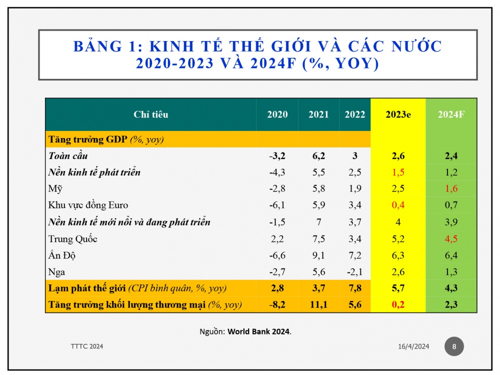 Theo Nhóm nghiên cứu, năm 2024, kinh tế thế giới dự báo đi ngang hoặc tăng trưởng chậm lại (2,4% so với mức tăng 2,6% năm 2023) dù thương mại và đầu tư dần phục hồi, lạm phát toàn cầu tiếp tục giảm (3,5-4% từ mức 5,7% năm 2023).