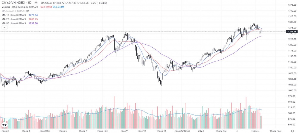 Áp lực bán chủ động gia tăng đầu phiên chiều khiến chỉ số chung nhanh chóng trượt điểm xuống dưới tham chiếu. Phần lớn nhóm ngân hàng chìm trong sắc đỏ và thị trường chung cũng nghiêng nhiều hơn về phía giảm điểm. Các nhà đầu tư dường như vẫn rất thận trọng trong thời điểm này khi tín hiệu hồi phục của VN-Index chưa đủ thuyết phục. Nửa cuối phiên chiều, chỉ số chung tăng điểm trở lại nhờ nhóm cổ phiếu trụ có dấu hiệu hồi phục. Khối ngoại sau khi mua ròng đầu phiên sáng thì thời gian giao dịch còn lại trong ngày bán ròng mạnh với tổng giá trị ròng đạt 550,76 tỷ, tập trung bán VHM, NVL, VPB. Kết phiên, VN-Index đóng cửa tại 1.258.56 điểm, giảm 4,26 điểm, tương đương 0,34%.