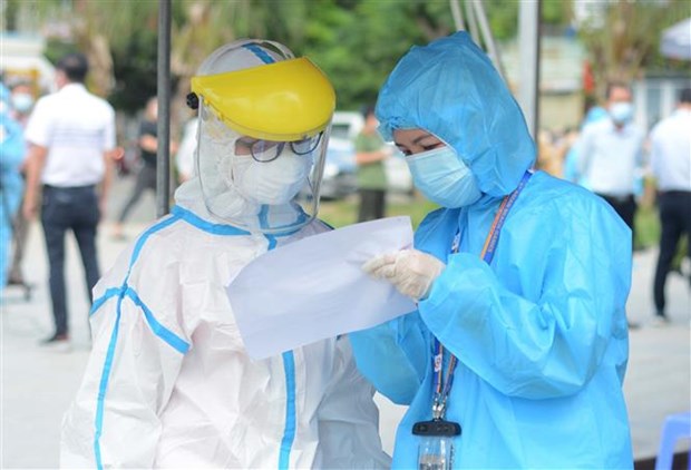 Nhân viên y tế kiểm tra danh sách người xét nghiệm. (Ảnh: Văn Dũng/TTXVN)