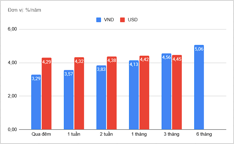 Đối với các giao dịch USD, lãi suất bình quân các kỳ hạn có xu hướng ít biến động so với tuần trước. Cụ thể, lãi suất bình quân kỳ hạn qua đêm và 1 tuần không đổi so với tuần trước, lần lượt giữ ở mức 4,29%/năm và 4,32%/năm. Lãi suất bình quân kỳ hạn 1 tháng giảm nhẹ 0,03%/năm xuống mức 4,42%/năm.