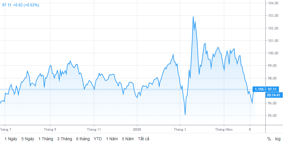 Trên thị trường thế giới, chỉ số đô la Mỹ (DXY) đo lường biến động đồng bạc xanh với 6 đồng tiền chủ chốt (EUR, JPY, GBP, CAD, SEK, CHF) hiện ở mức 97,11 điểm, tăng 0,02 điểm (0,02%) so với giá mở cửa.