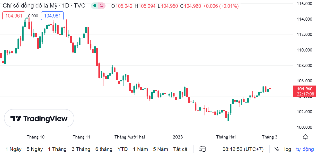 Chỉ số đô la Mỹ (DXY), đo lường biến động của bạc xanh so với 6 đồng tiền chủ chốt (EUR, JPY, GBP, CAD, SEK, CHF), cập nhật đến đầu giờ sáng nay theo giờ Việt Nam ở mức 104,960 điểm, tăng nhẹ 0,006 điểm (+0,01%) so với thời điểm mở cửa.