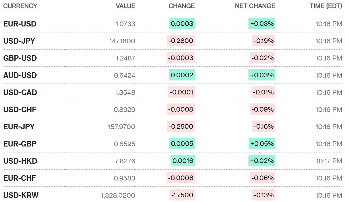 Đồng euro đã tăng 0,03% lên mức 1,0733 USD. Ngược lại, đồng bảng Anh giảm 0,02% xuống mức 1,2487 USD.
