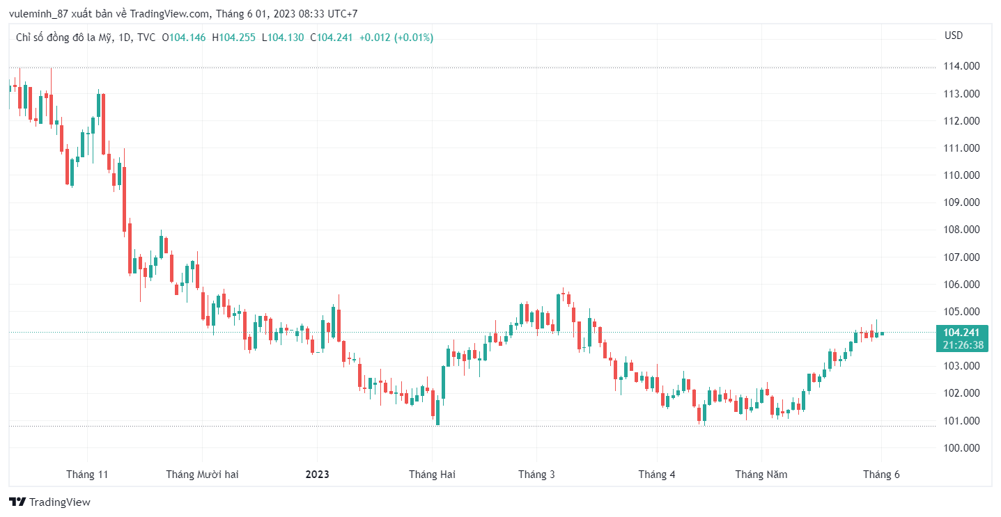 Chỉ số đô la Mỹ (DXY), đo lường biến động của bạc xanh so với 6 đồng tiền chủ chốt (EUR, JPY, GBP, CAD, SEK, CHF), cập nhật đến đầu giờ sáng nay theo giờ Việt Nam ở mức 104,241 điểm, tăng 0,091 điểm so với thời điểm mở cửa.