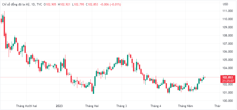 Chỉ số đô la Mỹ (DXY), đo lường biến động của bạc xanh so với 6 đồng tiền chủ chốt (EUR, JPY, GBP, CAD, SEK, CHF), cập nhật đến đầu giờ sáng nay theo giờ Việt Nam ở mức 102,853 điểm, giảm nhẹ 0,006 điểm (-0,01%) so với thời điểm mở cửa.