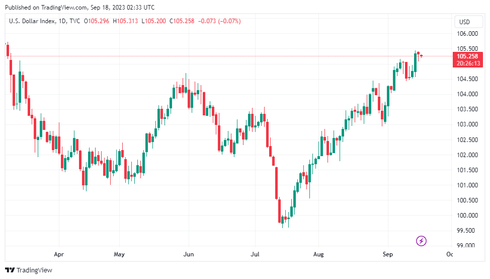 Chỉ số đô la Mỹ (DXY), đo lường biến động của bạc xanh so với 6 đồng tiền chủ chốt (EUR, JPY, GBP, CAD, SEK, CHF), hiện ở mức 105,258 điểm, giảm 0,0342 điểm so với thời điểm mở cửa.