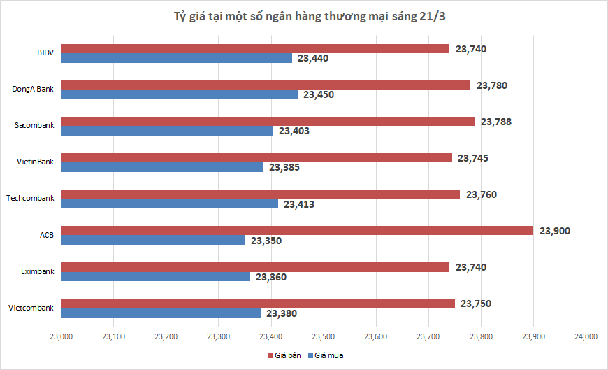 Cụ thể, tính đến 9h sáng nay, giá mua USD thấp nhất đang ở 23.350 VND/USD, giá mua cao nhất đang ở mức 23.450 VND/USD. Trong khi đó ở chiều bán ra, giá bán thấp nhất đang ở 23.740 VND/USD, giá bán cao nhất đang ở 23.900 VND/USD.
