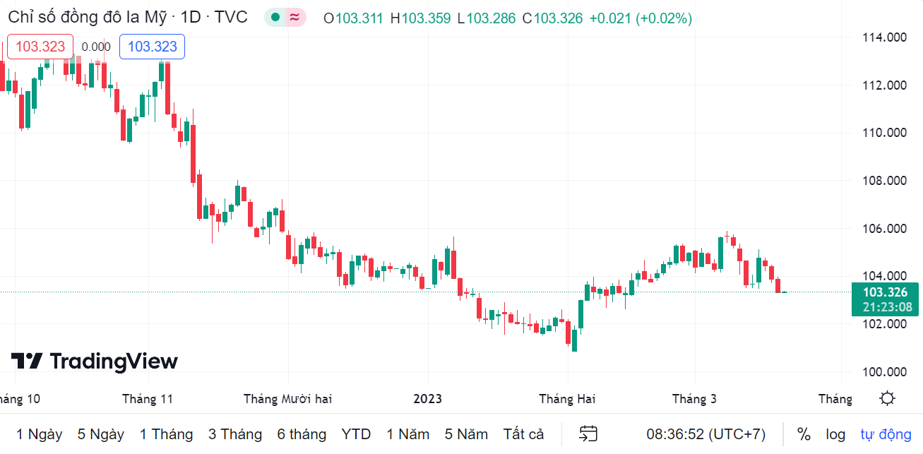 Chỉ số đô la Mỹ (DXY), đo lường biến động của bạc xanh so với 6 đồng tiền chủ chốt (EUR, JPY, GBP, CAD, SEK, CHF), cập nhật đến đầu giờ sáng nay theo giờ Việt Nam ở mức 103,326 điểm, tăng nhẹ 0,021 điểm (+0,02%) so với thời điểm mở cửa.