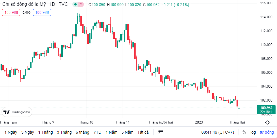Chỉ số đô la Mỹ (DXY), đo lường biến động của bạc xanh so với 6 đồng tiền chủ chốt (EUR, JPY, GBP, CAD, SEK, CHF), cập nhật đến đầu giờ sáng nay theo giờ Việt Nam ở mức 100,962 điểm, giảm 0,221 điểm (-0,21%) so với thời điểm mở cửa.
