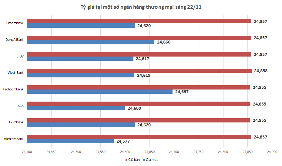 Cụ thể, tính đến 9h sáng nay, giá mua thấp nhất đang ở 24.577 VND/USD, giá mua cao nhất đang ở mức 24.697 VND/USD. Trong khi đó ở chiều bán ra, giá bán thấp nhất đang ở 24.855 VND/USD, giá bán cao nhất đang ở 24.858 VND/USD.