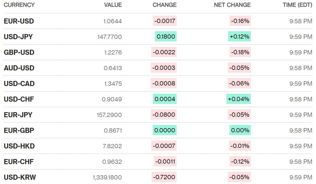 Trong khi đó, yên Nhật giảm 0,12% xuống mức 147,77 yên đổi một USD, gần mức thấp nhất trong hơn 10 tháng của phiên trước là 148,465 yên đổi một USD.