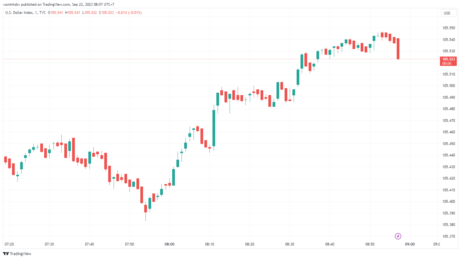 Chỉ số đô la Mỹ (DXY), đo lường biến động của bạc xanh so với 6 đồng tiền chủ chốt (EUR, JPY, GBP, CAD, SEK, CHF), hiện ở mức 105,523 điểm, giảm 0,143 điểm so với thời điểm mở cửa.