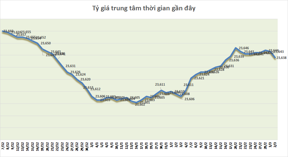 Ngân hàng Nhà nước Việt Nam (NHNN) sáng nay niêm yết tỷ giá trung tâm ở 23.638 đồng, giảm 5 đồng so với phiên trước đó. Như vậy, tỷ giá trung tâm đã có phiên giảm thứ hai liên tiếp với tổng mức giảm là 6 đồng.