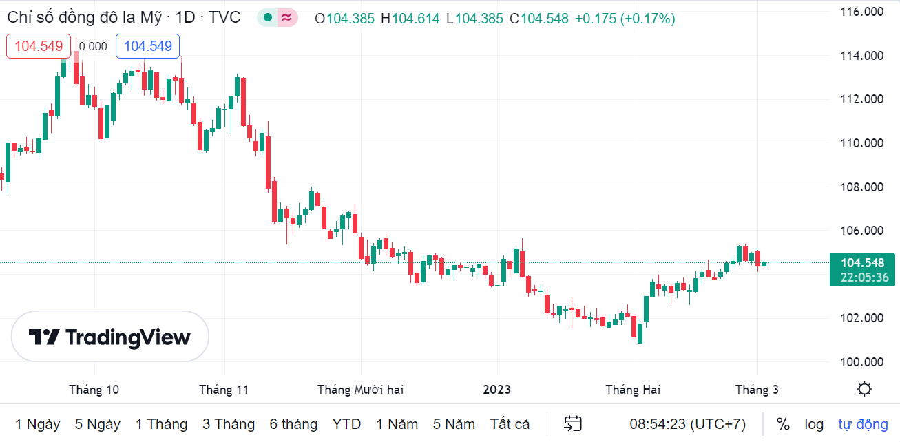 Chỉ số đô la Mỹ (DXY), đo lường biến động của bạc xanh so với 6 đồng tiền chủ chốt (EUR, JPY, GBP, CAD, SEK, CHF), cập nhật đến đầu giờ sáng nay theo giờ Việt Nam ở mức 104,548 điểm, tăng 0,175 điểm (+0,17%) so với thời điểm mở cửa.