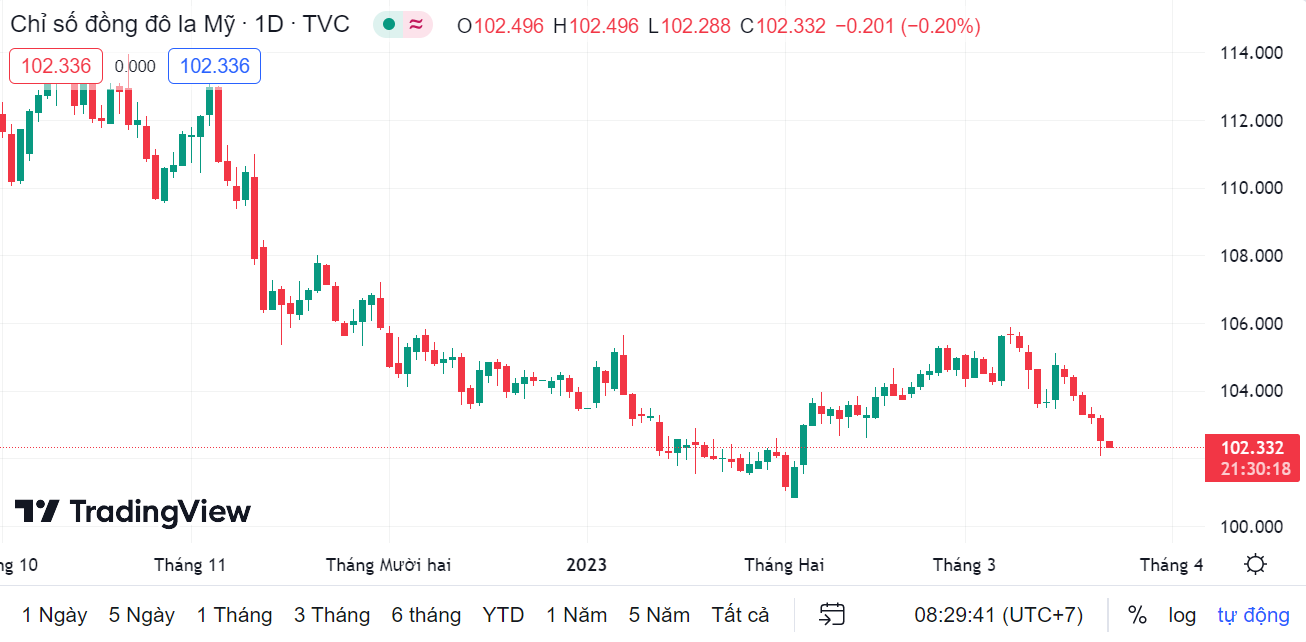 Chỉ số đô la Mỹ (DXY), đo lường biến động của bạc xanh so với 6 đồng tiền chủ chốt (EUR, JPY, GBP, CAD, SEK, CHF), cập nhật đến đầu giờ sáng nay theo giờ Việt Nam ở mức 102,332 điểm, giảm 0,201 điểm (-0,2%) so với thời điểm mở cửa.