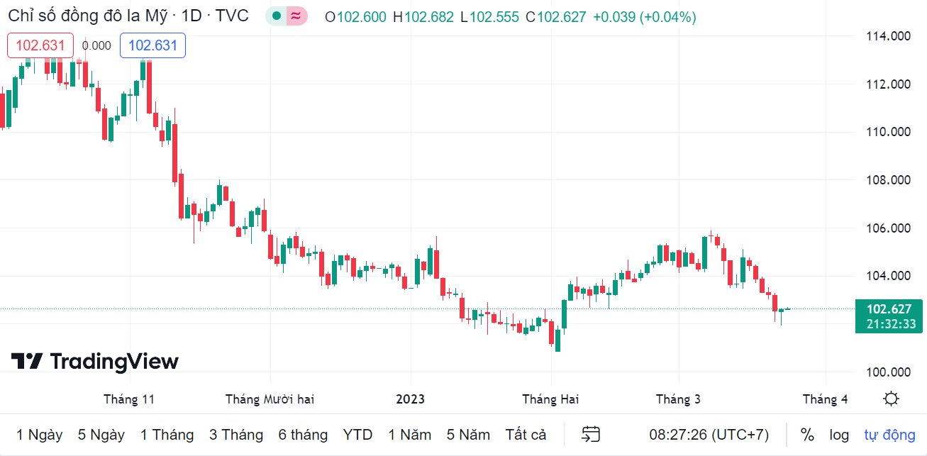 Chỉ số đô la Mỹ (DXY), đo lường biến động của bạc xanh so với 6 đồng tiền chủ chốt (EUR, JPY, GBP, CAD, SEK, CHF), cập nhật đến đầu giờ sáng nay theo giờ Việt Nam ở mức 102,627 điểm, tăng nhẹ 0,039 điểm (+0,04%) so với thời điểm mở cửa.