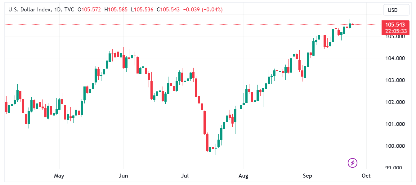 Chỉ số đô la Mỹ (DXY), đo lường biến động của bạc xanh so với 6 đồng tiền chủ chốt (EUR, JPY, GBP, CAD, SEK, CHF), hiện ở mức 105,543 điểm, giảm 0,039 điểm (-0,04%) so với thời điểm mở cửa.