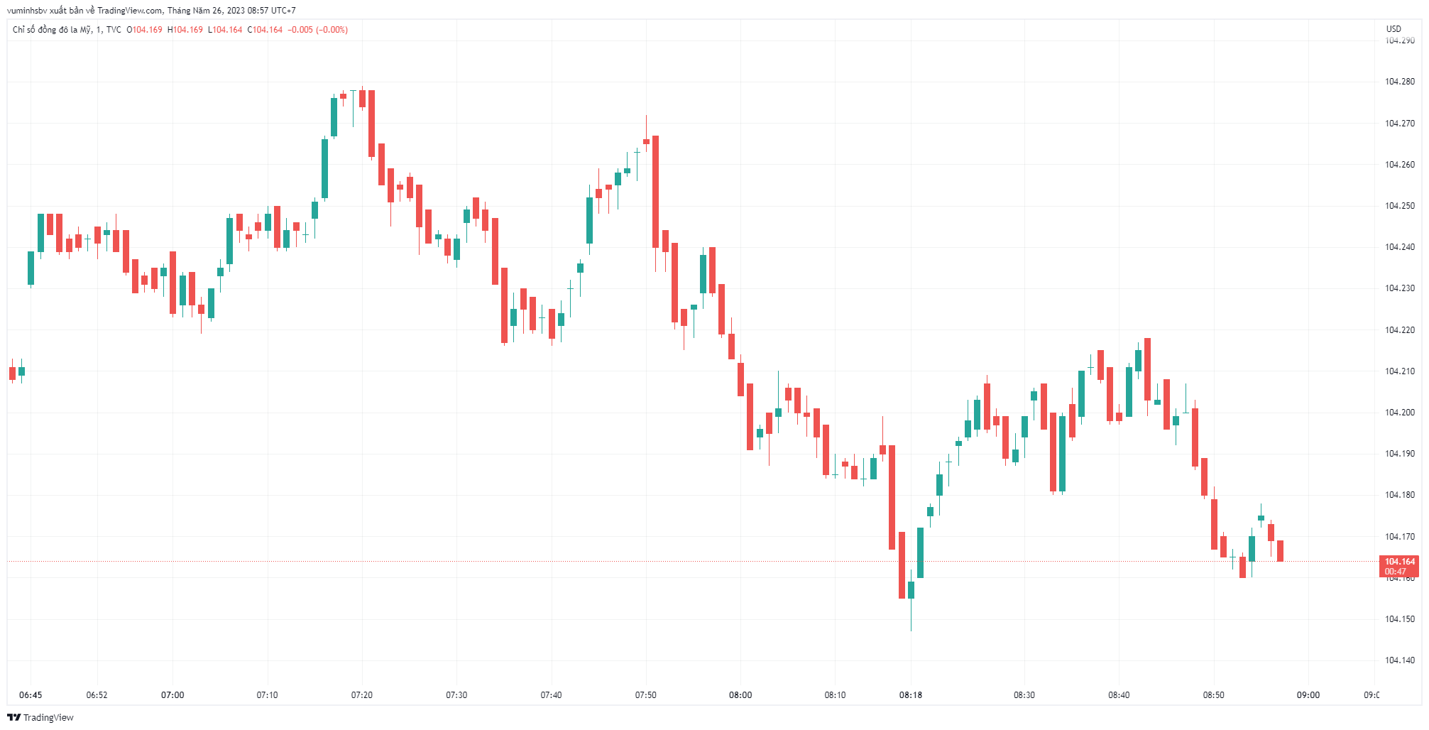 Chỉ số đô la Mỹ (DXY), đo lường biến động của bạc xanh so với 6 đồng tiền chủ chốt (EUR, JPY, GBP, CAD, SEK, CHF), cập nhật đến đầu giờ sáng nay theo giờ Việt Nam ở mức 104,164 điểm, giảm 0,066 điểm so với thời điểm mở cửa.