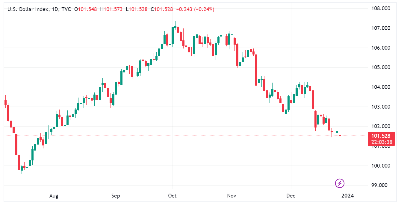 Chỉ số bạc xanh đang có xu hướng giảm 1,9% khi kết thúc năm 2023 sau hai năm tăng mạnh liên tiếp nhờ việc Fed tăng lãi suất để chống lạm phát.