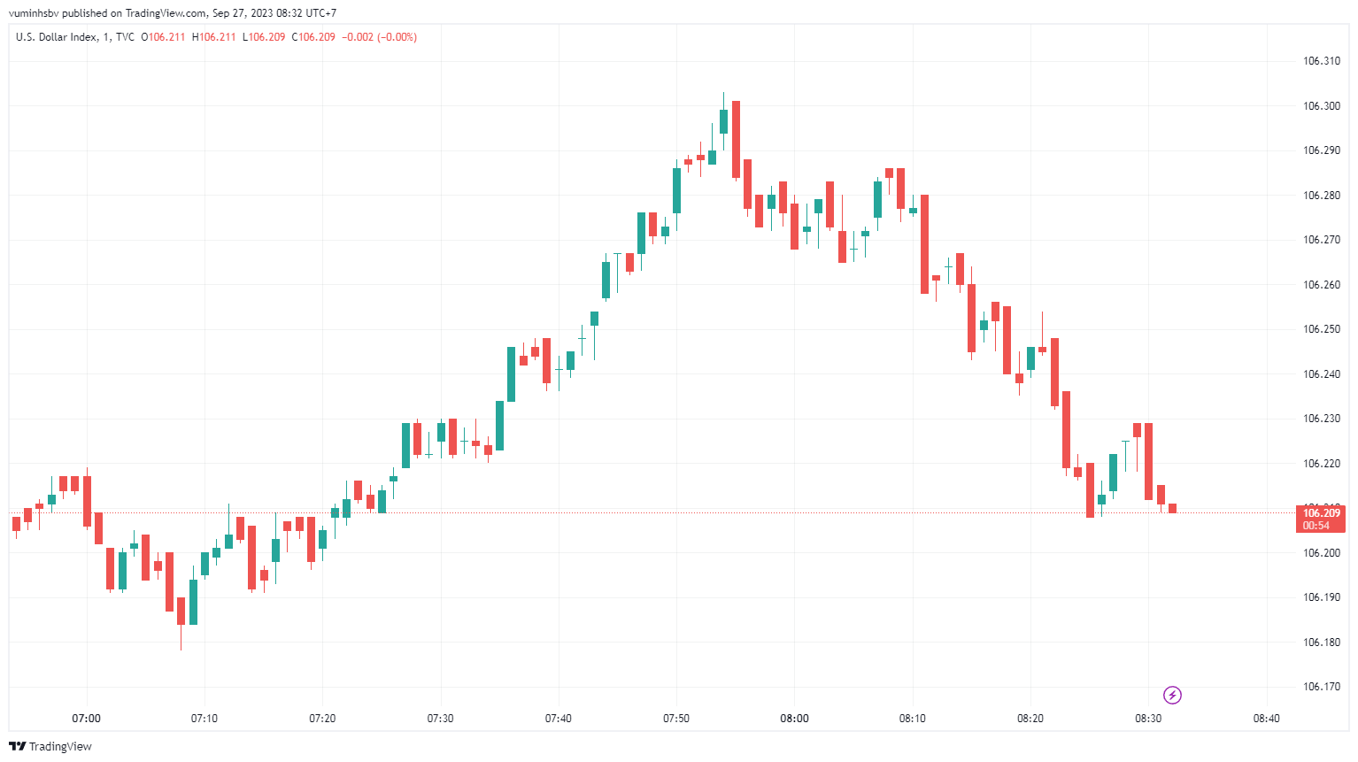 Chỉ số đô la Mỹ (DXY), đo lường biến động của bạc xanh so với 6 đồng tiền chủ chốt (EUR, JPY, GBP, CAD, SEK, CHF), hiện ở mức 106,209 điểm, giảm 0,011 điểm so với thời điểm mở cửa.