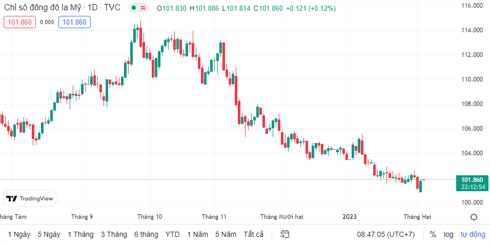 Chỉ số đô la Mỹ (DXY), đo lường biến động của bạc xanh so với 6 đồng tiền chủ chốt (EUR, JPY, GBP, CAD, SEK, CHF), cập nhật đến đầu giờ sáng nay theo giờ Việt Nam ở mức 101,860 điểm, tăng +0,121 điểm (+0,12%) so với thời điểm mở cửa.