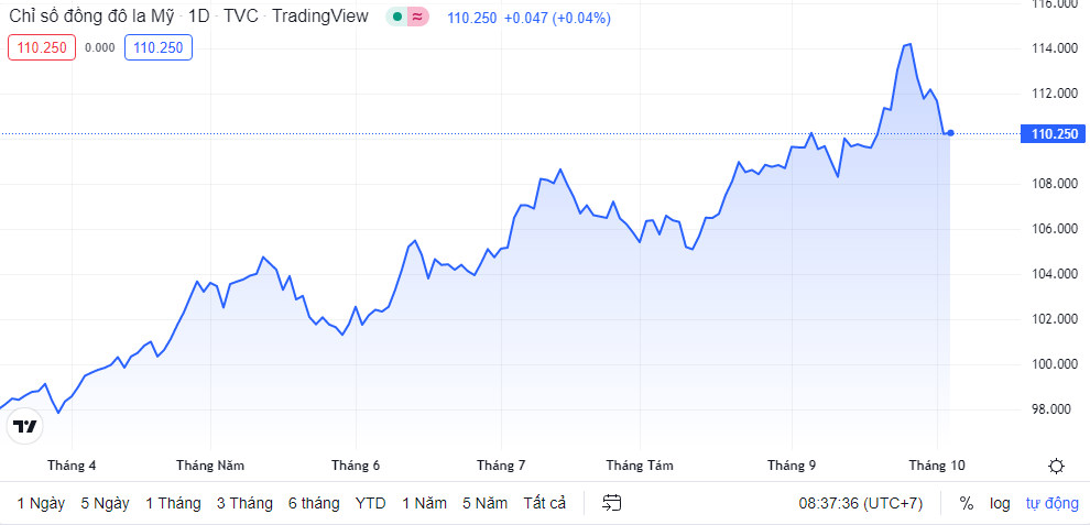 Chỉ số đô la Mỹ (DXY), đo lường biến động của bạc xanh so với 6 đồng tiền chủ chốt (EUR, JPY, GBP, CAD, SEK, CHF), cập nhật đến đầu giờ sáng nay theo giờ Việt Nam ở mức 110,250 điểm, tăng nhẹ 0,047 điểm (+0,04%) so với thời điểm mở cửa.
