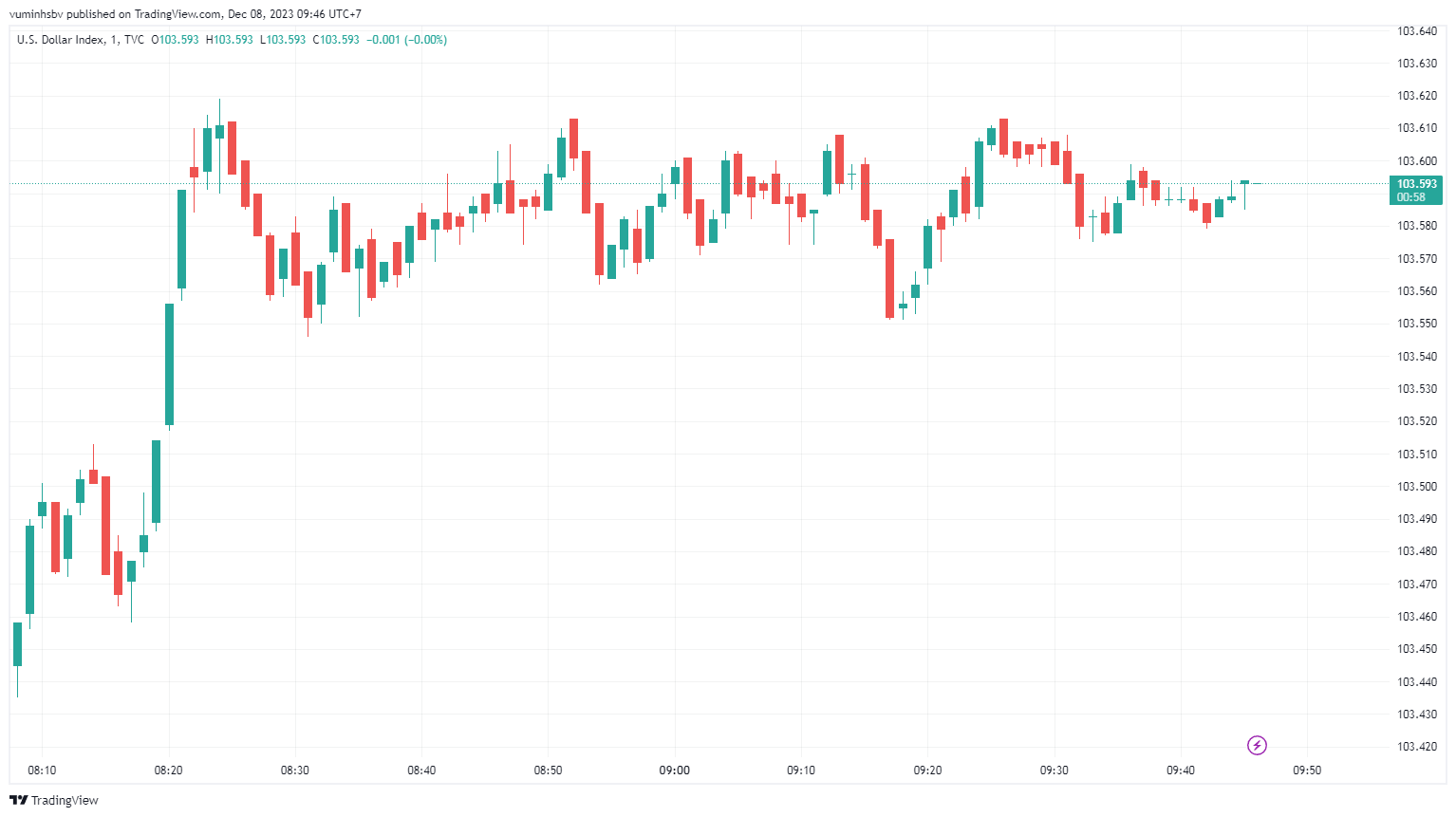 Chỉ số đô la Mỹ (DXY), đo lường biến động của bạc xanh so với 6 đồng tiền chủ chốt (EUR, JPY, GBP, CAD, SEK, CHF), hiện ở mức 103,593 điểm, giảm 0,047 điểm so với thời điểm mở cửa.