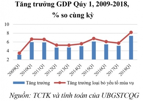 Trong các quý còn lại của năm 2018, nếu tổng cầu tiếp tục có những diễn biến tích cực như cầu tiêu dùng duy trì được đà tăng như Quý I; đầu tư tư nhân tiếp tục tăng cao trong bối cảnh niềm tin vào tăng trưởng kinh tế khả quan; tích cực đẩy mạnh giải ngân vốn đầu tư công ngay từ đầu Quý II/2018 để hỗ trợ tăng trưởng… thì tăng trưởng của nền kinh tế có thể vượt kế hoạch 6,5 - 6,7% đề ra cho năm 2018.