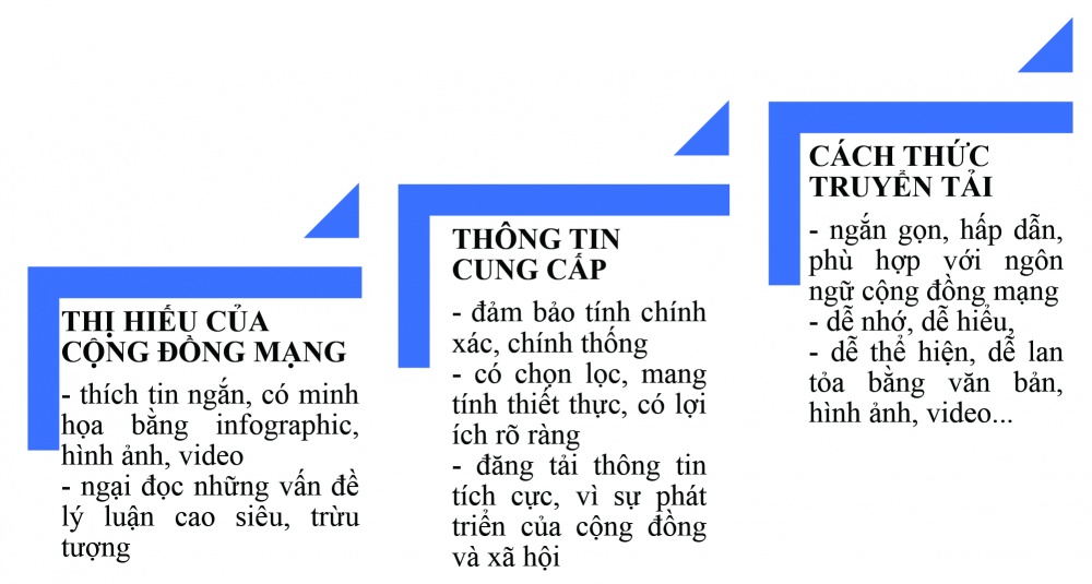 Cùng với đội ngũ nhân sự chuyên nghiệp, cần thường xuyên phát triển các nội dung riêng cho mạng xã hội, thay vì chỉ đăng lại các tin tức trên website hoặc chia sẻ đường link từ báo chí. Để hoạt động truyền thông chính sách trên mạng xã hội hiệu quả, cần bám sát các yếu tố sau: