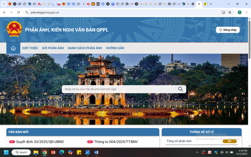 Thực hiện Quyết định số 244/QĐ-TTg ngày 05/02/2025 của Thủ tướng Chính phủ về việc phê duyệt Đề án "Ứng dụng công nghệ số trong việc tiếp nhận, xử lý phản ánh, kiến nghị về văn bản quy phạm pháp luật", trong thời gian qua, Bộ Tư pháp đã nghiên cứu xây dựng Hệ thống thông tin tiếp nhận, xử lý phản ánh, kiến nghị về văn bản quy phạm pháp luật (Hệ thống thông tin).