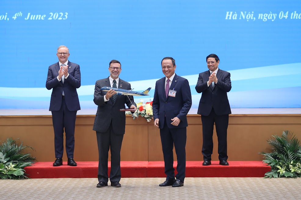 Cũng tại buổi lễ, Thủ tướng Phạm Minh Chính và Thủ tướng Anthony Albanese chứng kiến việc trao Giấy chứng nhận khai trương đường bay thẳng Thành phố Hồ Chí Minh - Brisbane của Vietjet Air và công bố khai trương đường bay Hà Nội - Melbourne - Hà Nội của Vietnam Airlines.