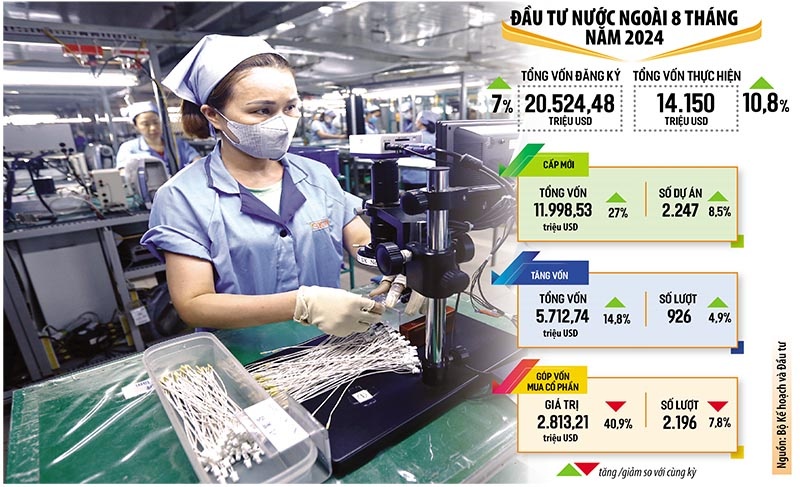 Chẳng hạn, trong 8 tháng đầu năm 2024 có hơn 20,52 tỷ USD vốn đầu tư nước ngoài đăng ký vào Việt Nam, tăng 7% so với cùng kỳ năm 2023. Vốn giải ngân trong 8 tháng đạt khoảng 14,15 tỷ USD, tăng 8% so với cùng kỳ năm ngoái. Trong đó, vốn đầu tư mới cũng như vốn tăng thêm vẫn tăng khá mạnh. Theo số liệu của Cục Đầu tư nước ngoài (Bộ Kế hoạch và Đầu tư), 8 tháng đầu năm 2024, có 2.247 dự án đăng ký mới, với tổng vốn đăng ký gần 12 tỷ USD, tương ứng tăng 8,5% và tăng 27% so với cùng kỳ. Trong khi đó, với 926 lượt dự án đăng ký điều chỉnh vốn đầu tư (tăng 4,9% so với cùng kỳ), vốn đăng ký tăng thêm hơn 5,7 tỷ USD (tăng 27% so với cùng kỳ).