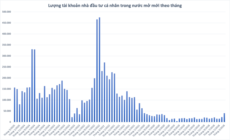 Tổng cộng, thị trường chứng khoán Việt Nam đang có hơn 9,88 triệu tài khoản giao dịch chứng khoán. Tài khoản mở mới tiếp tục tăng mạnh trở lại, bất chấp bối cảnh diễn biến thị trường chứng khoán Việt Nam trải qua những diễn biến đầy bất ổn trong tháng 4/2025.