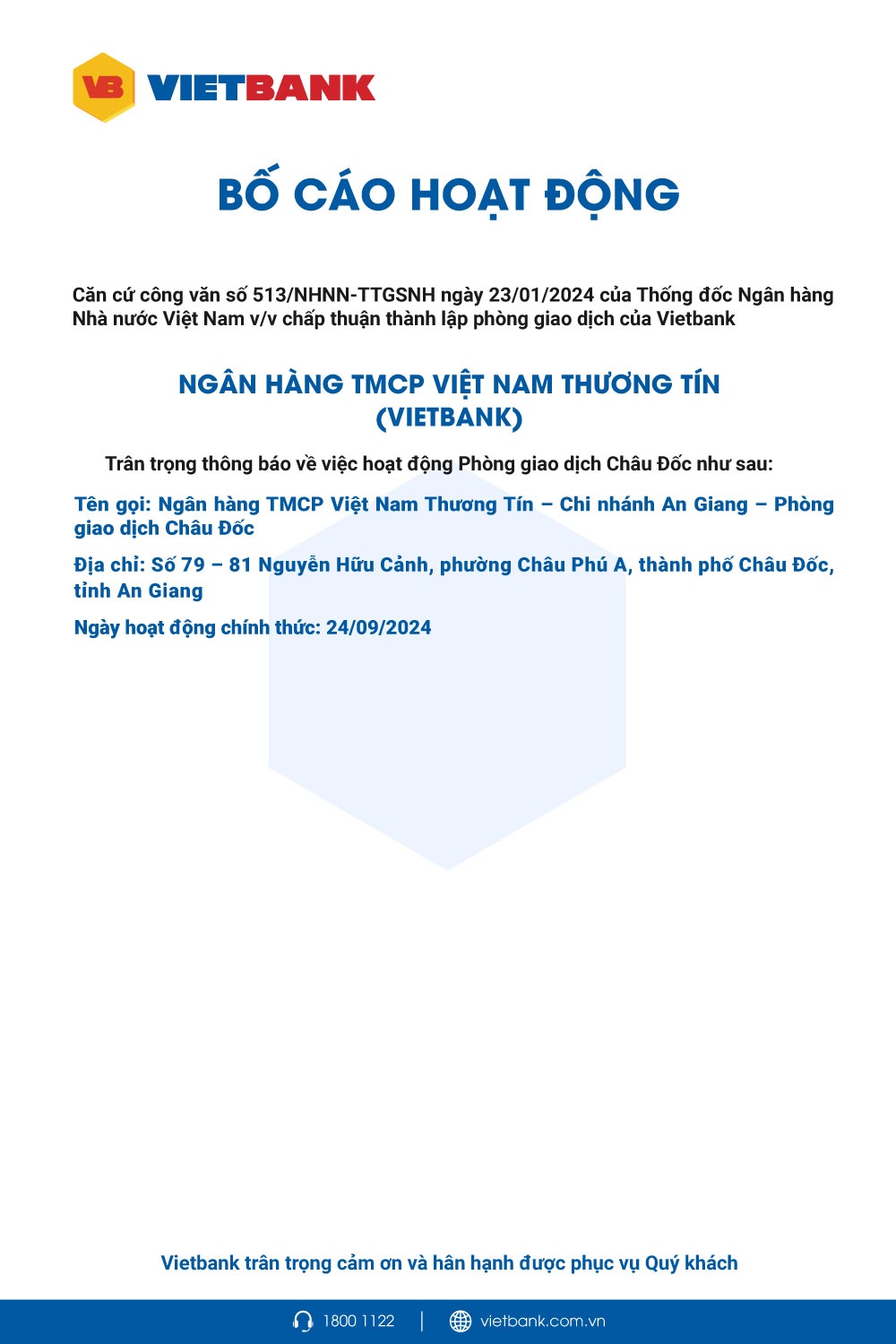 Vietbank: Bố cáo thành lập PGD Châu Đốc