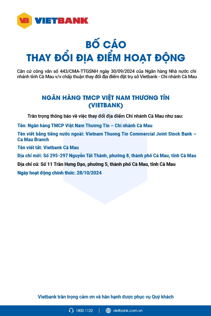Vietbank: Bố cáo thay đổi địa điểm hoạt động chi nhánh Cà Mau