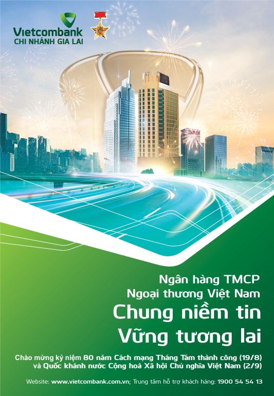 Hòa trong niềm tự hào kỷ niệm 80 năm Cách mạng Tháng Tám và Quốc khánh 2/9, Vietcombank Chi nhánh Gia Lai gửi lời tri ân sâu sắc đến Quý khách hàng đã luôn đồng hành, tin tưởng trong suốt chặng đường phát triển. Với phương châm “Chung niềm tin – Vững tương lai”, Vietcombank Gia Lai không ngừng đổi mới, nâng cao chất lượng dịch vụ, đáp ứng nhu cầu tài chính đa dạng, góp phần phát triển kinh tế – xã hội địa phương. Vietcombank Gia Lai cam kết tiếp tục là đối tác tin cậy, đồng hành cùng sự thịnh vượng của Quý khách hàng.
