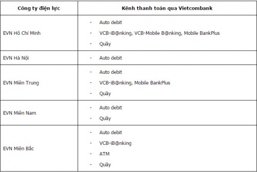 Đến nay, Vietcombank đã hợp tác triển khai dịch vụ với hầu hết các công ty điện lực trên cả nước nhằm phục vụ tốt nhất nhu cầu của khách hàng: