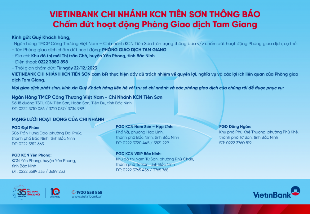 VietinBank chi nhánh KCN Tiên Sơn thông báo