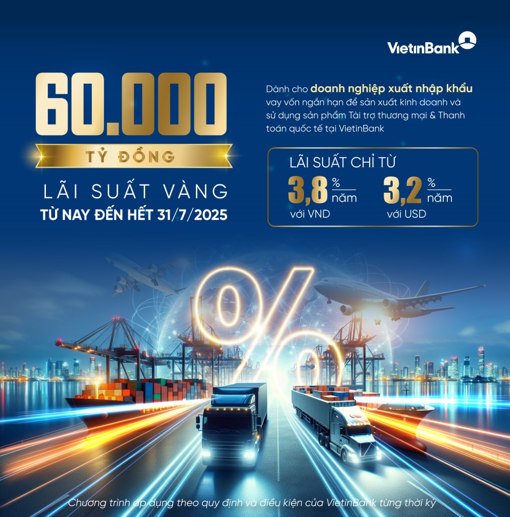 Thực hiện cam kết đồng hành cùng cộng đồng doanh nghiệp xuất nhập khẩu trên hành trình phát triển bền vững, VietinBank đã triển khai chương trình tín dụng Lãi suất vàng có quy mô lên đến 60.000 tỷ đồng. Chương trình kéo dài từ nay đến hết 31/7/2025. Với lãi suất đặc biệt ưu đãi, đây là cơ hội “vàng” để các doanh nghiệp tiếp cận nguồn vốn giá rẻ, chỉ từ 3,8%/năm đối với khoản vay bằng VND và chỉ từ 3,2%/năm đối với khoản vay bằng USD. Qua đó, VietinBank mong muốn hỗ trợ doanh nghiệp xuất nhập khẩu tối ưu hóa chi phí và gia tăng hiệu quả kinh doanh.