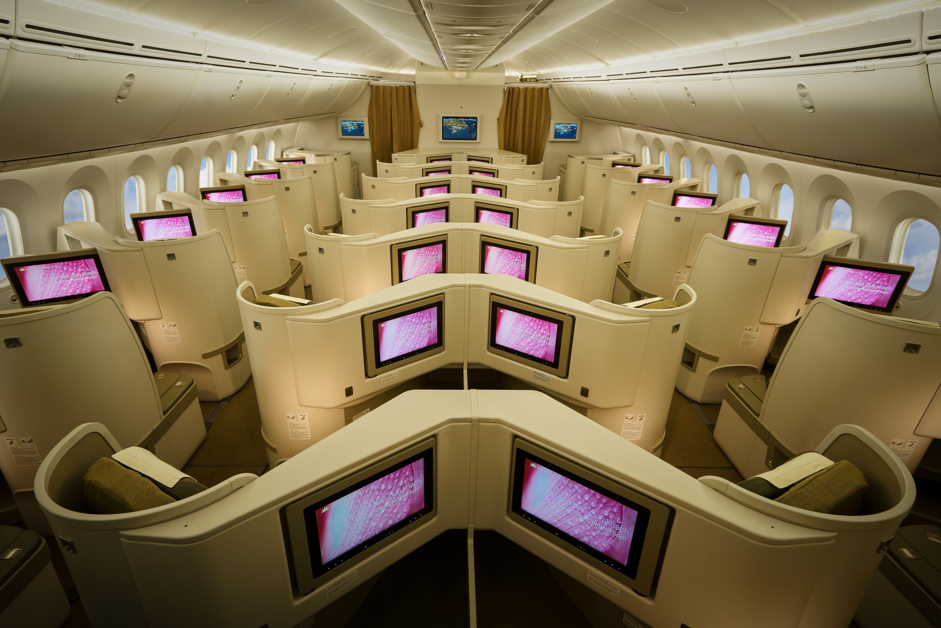 Với thiết kế hai lối đi tối ưu, các máy bay thân rộng như Boeing 787 và Airbus A350 có không gian ngồi rộng rãi, ghế hạng Thương gia có thể ngả phẳng 180 độ để hành khách được nghỉ ngơi trọn vẹn. Ánh sáng đèn LED, độ ẩm không khí và áp suất tạo cảm giác dễ chịu cho hành khách. Những tiện ích như ngăn hành lý, cửa sổ lớn hơn, cổng sạc USB tại ghế, màn hình giải trí cá nhân với chương trình giải trí đa dạng mang đến những trải nghiệm bay tuyệt vời trong suốt hành trình.