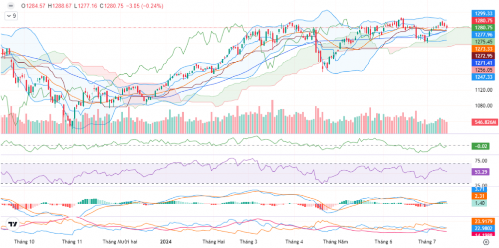 Trong phiên cuối tuần (12/7), VN-Index tiếp tục điều chỉnh rung lắc biên độ nhỏ với sự suy yếu của dòng tiền. Nhóm blue-chips ngoài VIC và FPT có đóng góp đáng kể cho chỉ số chung thì phần lớn các mã đều có diễn biến điều chỉnh. Thanh khoản trong phiên duy trì ở mức trung bình và lực cầu cũng thể hiện sự chần chừ cho thấy thị trường vẫn đang duy trì tâm lý thận trọng. Kết phiên, VN Index đóng cửa tại 1.280,75 điểm, giảm 3,05 điểm, tương đương 0,24%. Kết tuần, VN-Index giảm 2,29 điểm (-0,18%) so với tuần trước.