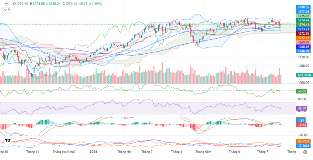 Ở khung đồ thị giờ, chỉ báo RSI và MACD hướng lên sau khi rơi xuống vùng quá bán thêm phần khẳng định cho vận động của dòng tiền. Tuy nhiên đường +DI đang ở vùng thấp nên VN-Index vẫn cần thời gian để lấy lại cân bằng và quay lại mốc 1.280-1.290 điểm trong ngắn hạn.